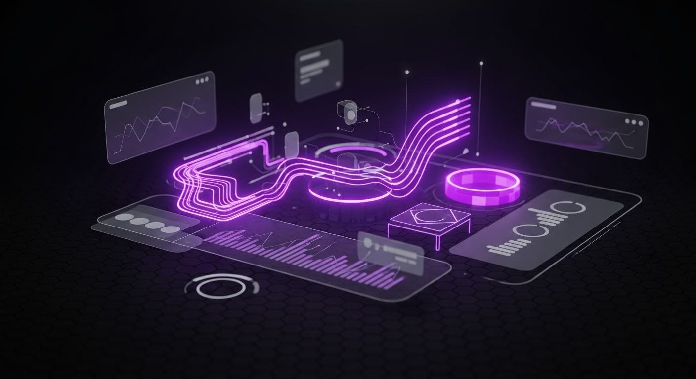 A dark, wide banner illustration for a blog post on experimentation cadence. It features a glowing, abstract pipeline or pathway composed of interconnected segments moving upwards against a deep, dark gradient background, symbolizing systematic growth. The text overlay reads 'Experimentation Cadence Framework' in a modern, glowing white font. A subtle website logo is in the top-left corner. The image uses cinematic lighting with neon blue and purple accents, providing a professional and premium look.