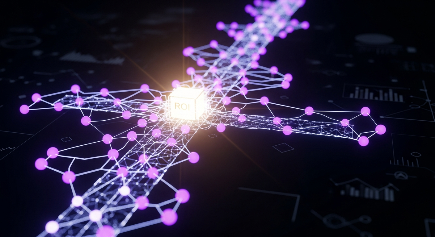 A dark, wide banner image depicting a glowing, abstract network of interconnected data points, with neon lines converging towards a stylized financial graph or ROI indicator, all against a deep blue-purple gradient background. The text 'Marketing Attribution Models: Measure ROI' is prominently displayed with a soft glow, and a subtle website logo is in the top-left corner.