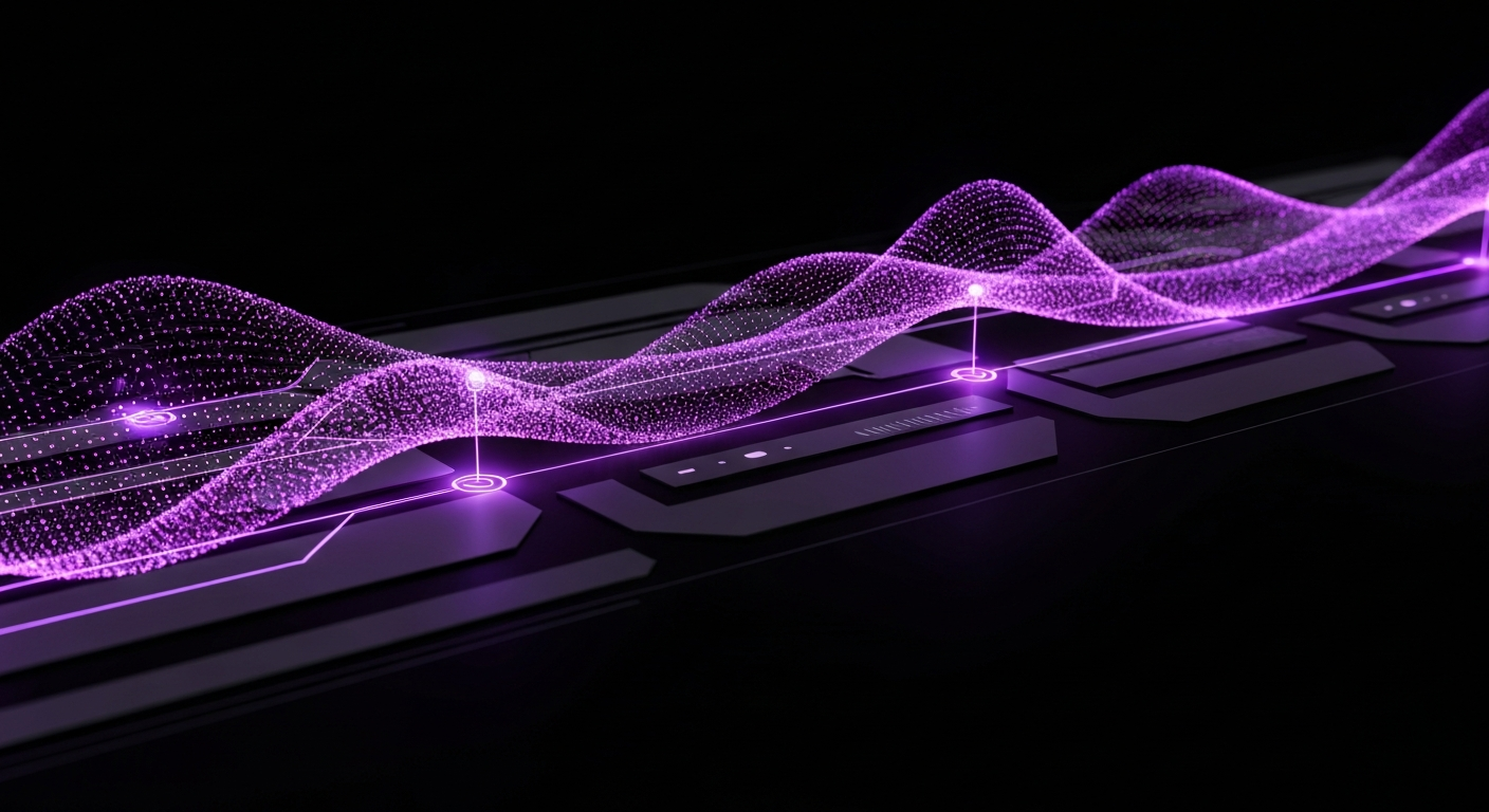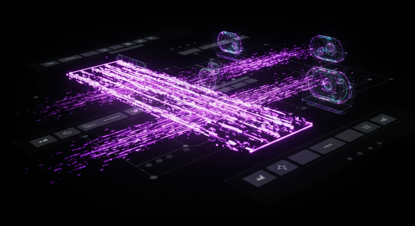 Abstract illustration of high-quality marketing data flowing cleanly, with subtle glowing elements. Fragmented data is filtered away on a dark, gradient background. The text 'Marketing Data Quality: Best Practices' glows in a modern sans-serif font. A subtle website logo is in the bottom-left corner. Represents data accuracy and cleansing for marketing success.